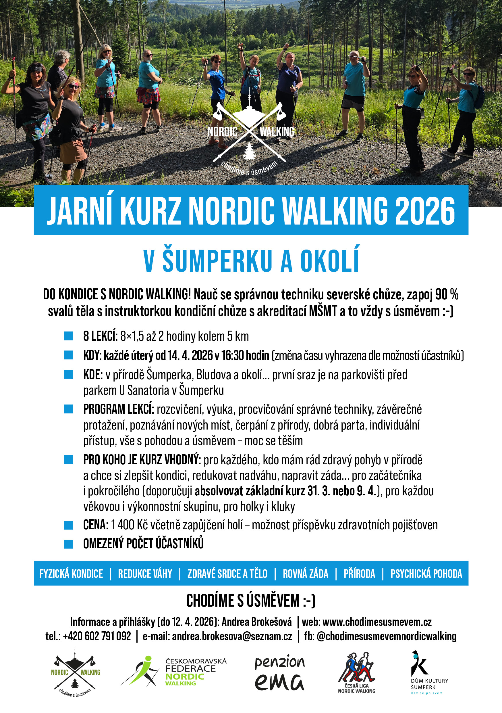 ► CENA: 1.400 Kč včetně zapůjčení holí – možnost příspěvku zdravotních pojišťoven