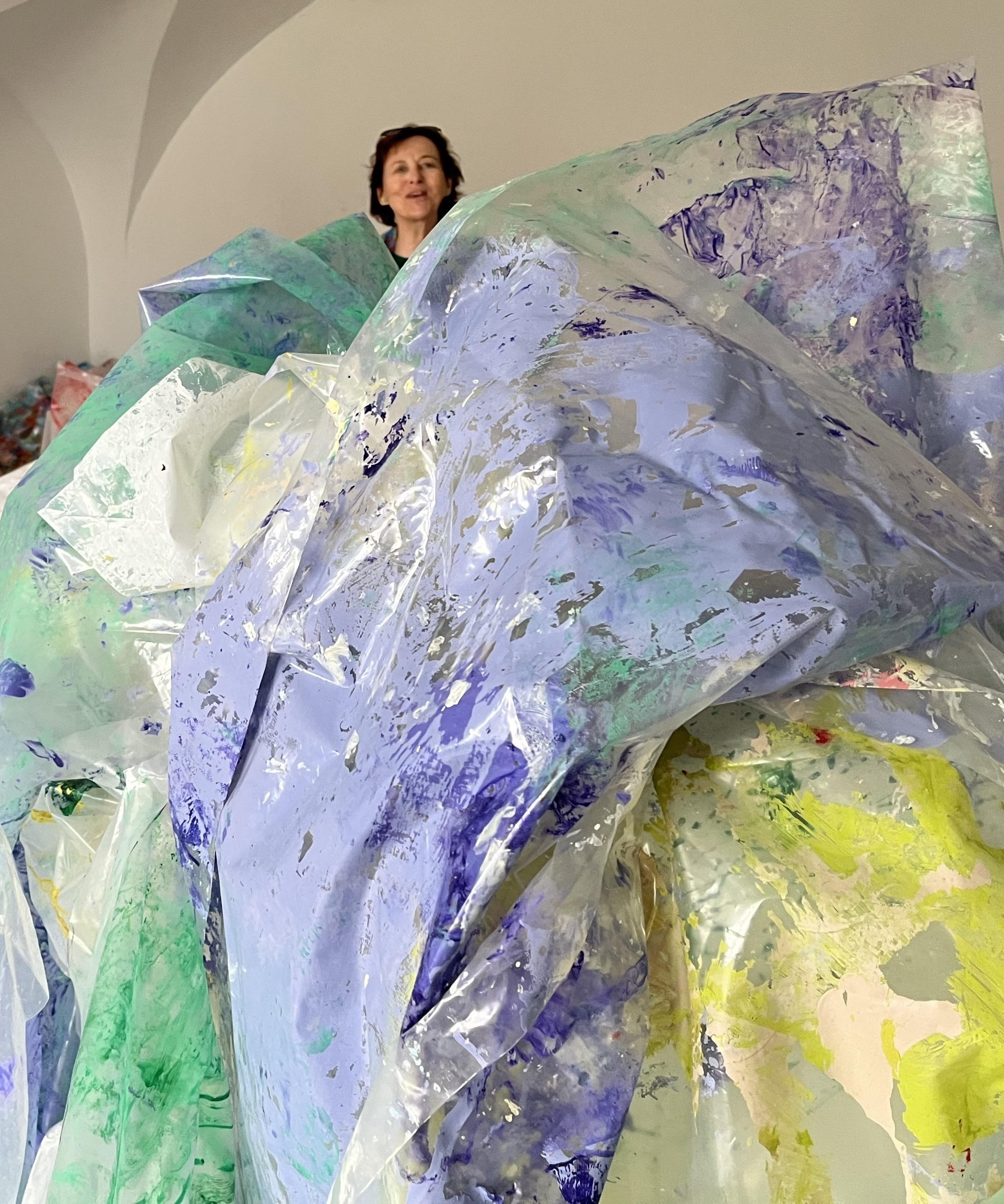 Její malířské gesto vtahuje své diváky do zkoumání barev, jejich vrstvení, prolínání, prostupování, ale i instalací.